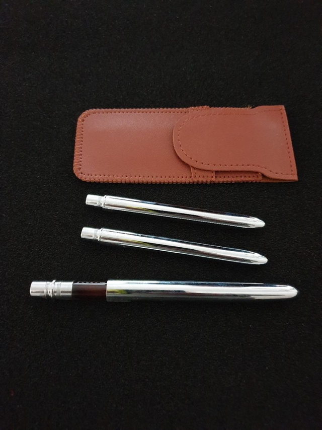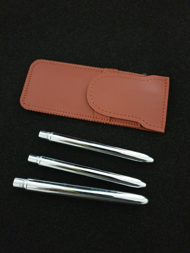 Etui en cuir et ses 3 pinceaux de voyage, manche en métal, démontable, poils imitation martre Kolinsky, taille 4,8,12.