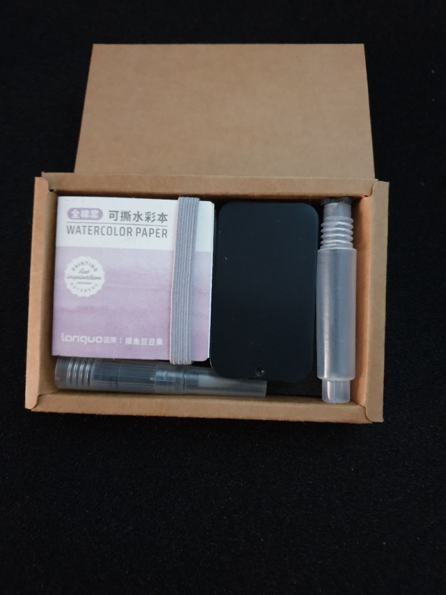 Kit aquarelles de voyage comprenant un petit carnet de voyage, 200g, un pinceau à réserve d'eau et un tiny box de 8 couleurs d'aquarelles extra-fines.